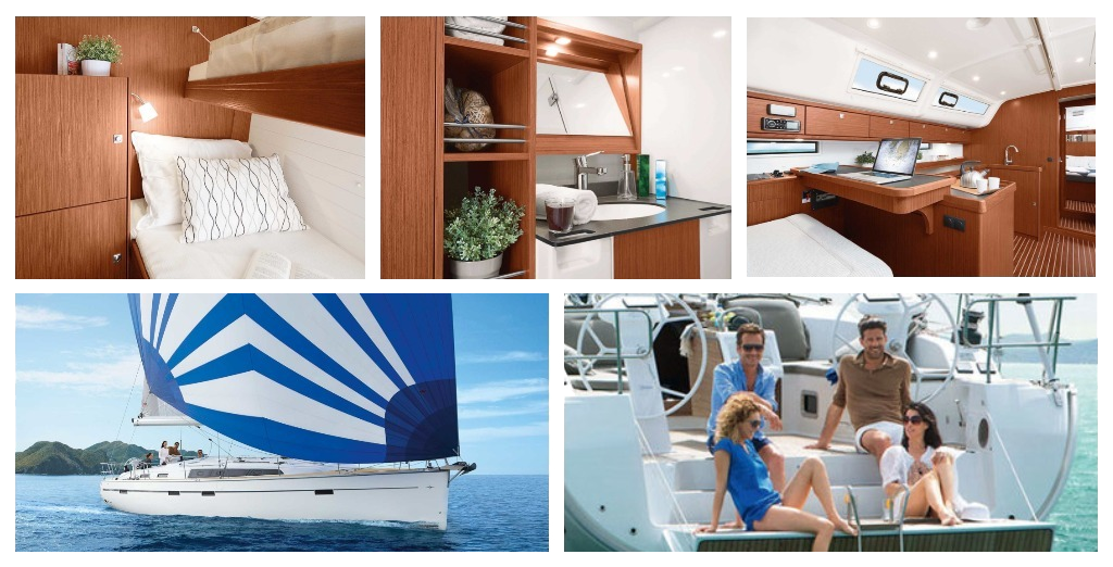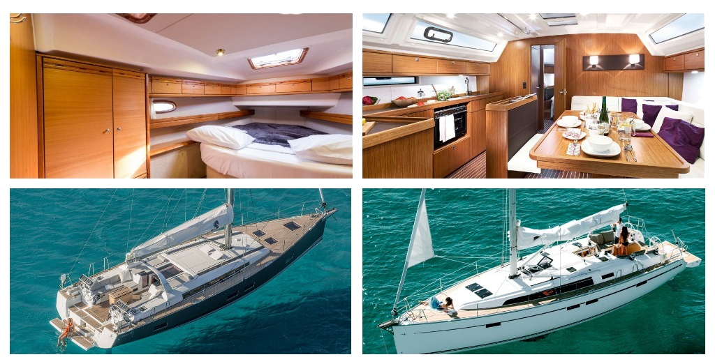 Современная комфортная яхта с 3 или 4 каютами. В кают-компании расположены U-образный диван и стол-трансформер, штурманский столик, приборная панель, камбуз, бар, рундуки.